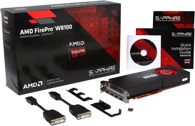 AMD Firepro W8100 graphics2x DisplayPort to DVI Active Cable (Single-Link)1x Dual Extender BracketDriver DiscQuick Installation Guide