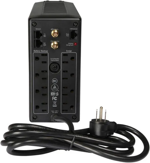 The back has five outlets for surge protection only, and five for battery backup and surge. The reset button is easy to get to, and the building wire fault is easy to see. Cons: Obtaining the Power Chute software was cludgy, their website had too many versions of products to scroll through. Overall Review: Configuring the unit using Power Chute on a computer, allows it to be setup for devices which are not computers. I did not have a reason to use the cable modem connectors on this unit.