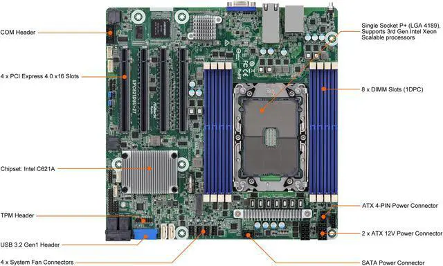 Internal Connector/HeadersOther Power Connectors: 1 (4-pin) for HDD power when using 12V DC-in power sourceAuxiliary Panel Header: 1 (18-pin): chassis intrusion ,system fault LED ,LAN1/LAN2 activity LED ,locate ,SMBusSystem Panel: 1 (9-pin): power switch ,reset switch ,system power LED ,HDD activity LEDCOM Header: 1Fan Header: 4 (4-pin)TPM Header: 1 (17-pin ,LPC) ,1 (13-pin ,SPI)VROC header: 1HSBP: 1SMBus header: 1PMB header: 1IPMB Header: 1Clear CMOS: 1 (contact pads)USB 3.2 (Gen1) Header: 1 (19-pin ,2 USB3.2 Gen1)NMI Header: 1Power Connector: 1 (4-pin ,ATX PSU signal) w ,ATX 24-pin adapter cable ,2 (8-pin ,ATX 12V) support 12V DC-in |