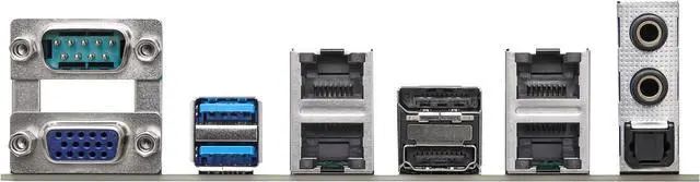 1 x COM (Serial Port) ,1 x D-Sub ,1 x DisplayPort ,1 x HDMI ,2 x USB 3.2 Gen 1 Type-A ,3 x Audio Jacks ,4 x LAN (RJ45) |