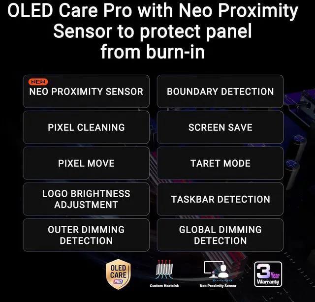 New ASUS OLED Care Pro technology provides a full set of customizable monitor settings to protect the OLED panel and ensure longevity. Plus, it includes the new Neo Proximity Sensor that detects your distance from the monitor and transitions to a black image when you’re away to safeguard the panel from burn-in. All settings can be easily managed via DisplayWidget Center.