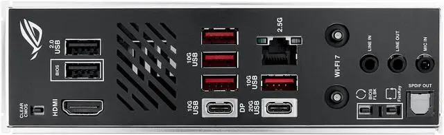 1 x USB 20Gbps port(s) 5 x USB 10Gbps port(s) (4 x Type-A + 1 x USB Type-C with DP Alt mode)2 x USB 2.0 port(s) (2 x Type-A) 1 x HDMI port1 x Wi-Fi module1 x Intel 2.5Gb Ethernet port3 x Audio jacks 1 x Optical S/PDIF out port1 x BIOS FlashBack button 1 x Clear CMOS button 1 x FlexKey button |