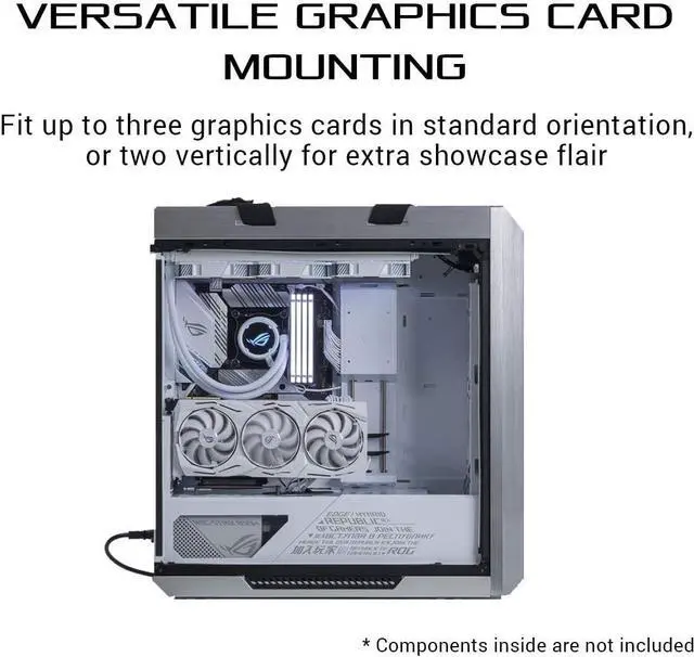 Premium design & aesthetics: Made for showcase builds with three tempered-glass panels ,brushed-aluminum frame and integrated Aura Sync RGB front lightingClean build made easy: A multifunction cover with graphics card holders ,a PSU shroud and a translucent rear cable cover offer effortless cable managementVersatile GPU mounting: Install three graphics cards in standard orientation ,or two vertically for extra showcase flair using a bundled bracketReady for serious cooling: Supports an up to EATX motherboard ,with room for 420mm front radiators and water-cooling pump and reservoirAdvanced I/O panel: USB 3.1 Gen 2 Type-C port ,four USB 3.0 ports ,an RGB-lighting control button and a fan-speed control buttonComfortable case handles: Easily carry your prized build to LAN parties with ergonomic and stylish fabric handles |