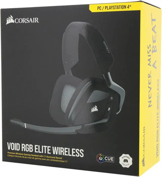 Stunning Sound: Hear everything from the lightest footstep to the most thundering explosion thanks to premium ,custom-tuned 50mm high-density neodymium audio drivers with an expanded frequency range of 20Hz-30,000Hz.Enduring Comfort: Breathable microfiber mesh fabric and plush memory foam earpads keep you comfortable even during long gaming sessions.Low-Latency 2.4GHz Wireless: Connect wirelessly to your PC or PS4* with the included USB adapter.Optimized Omnidirectional Microphone: Picks up your voice with exceptional clarity ,with a flip-up mute function and a built-in LED mute indicator.Durable Construction with Aluminum Yokes: Built to last through years of gaming.Immersive 7.1 Surround Sound: Create a multi-channel audio experience on PC that puts you right in the middle of your game.Wireless Freedom: Up to 40 ft. of wireless range and up to 16 hours of battery life. Never interrupt your gaming with the ability to plug in and charge while playing.On-Ear Volume and Mute Controls: Make on-the-fly adjustments without distracting you from your game.Dynamic RGB Lighting: Customize your look with RGB lighting on each ear cup allowing for a near limitless array of colors and effects.Intelligent Control ,Unlimited Possibilities: CORSAIR iCUE software enables custom audio equalizer settings ,immersive 7.1 surround sound* ,sidetone control and RGB lighting synchronization with compatible CORSAIR peripherals ,coolers ,fans and more.Discord-Certified: For crystal-clear communication and outstanding sound.* 7.1 surround sound only available on PC. |