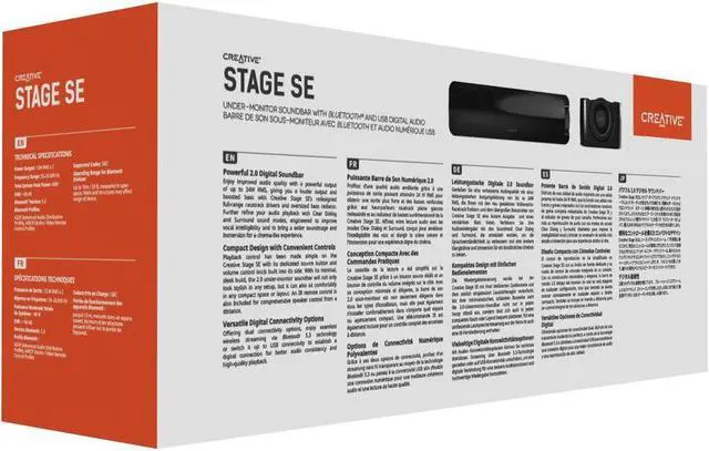 The Creative Stage SE is armed with Sound Blaster’s audio technologies—Clear Dialog and Surround, providing you with improved vocal intelligibility and wide surround experience in an instant. Enjoy a cinema-like experience at the comfort of your own home, and focus on your screen without having to depend on subtitles.