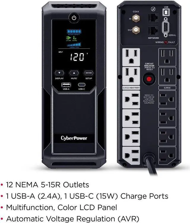 CyberPower CP1350AVRLCD3 Intelligent LCD UPS Systems – 1350VA/815W, 120 VAC, NEMA 5-15P, Mini-Tower, 12 Outlets