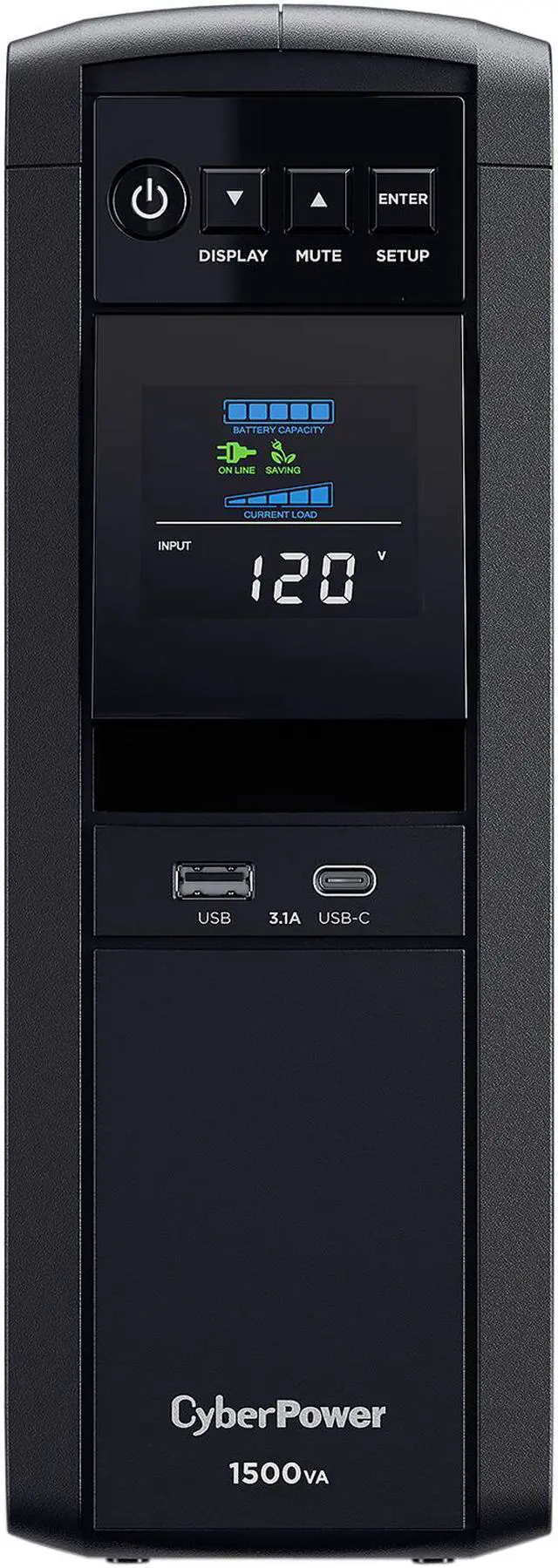 A mini-tower UPS with line interactive topology ,the CyberPower PFC Sinewave CP1500PFCLCD provides battery backup (using sine wave output) and surge protection for desktop computers ,workstations ,networking devices ,and home entertainment systems requiring active PFC power source compatibility.The CP1500PFCLCD features an advanced multifunction control panel with a color LCD to quickly confirm status and alerts at-a-glance. The screen tilts for easy viewing when the UPS is placed in a low position such as under a desk. Two USB charge ports (one Type-A and one Type-C) power portable devices such as mobile phones and tablets ,even during a utility power failure.The CP1500PFCLCD uses Automatic Voltage Regulation (AVR) to correct minor power fluctuations without switching to battery power ,which extends battery life. AVR is essential in areas where power fluctuations occur frequently. |
