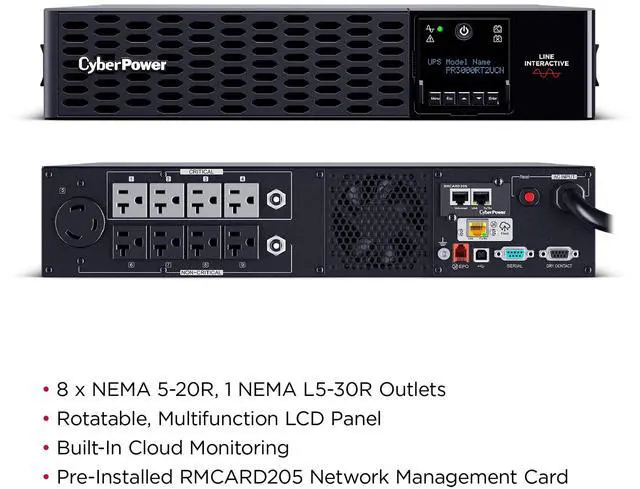 CyberPower PR3000RT2UCN Smart App Sinewave UPS Systems – 3000VA/3000W, 100 – 120 VAC, NEMA L5-30P, 2U, Rack / Tower, Sine Wave, 9 Outlets, LCD,