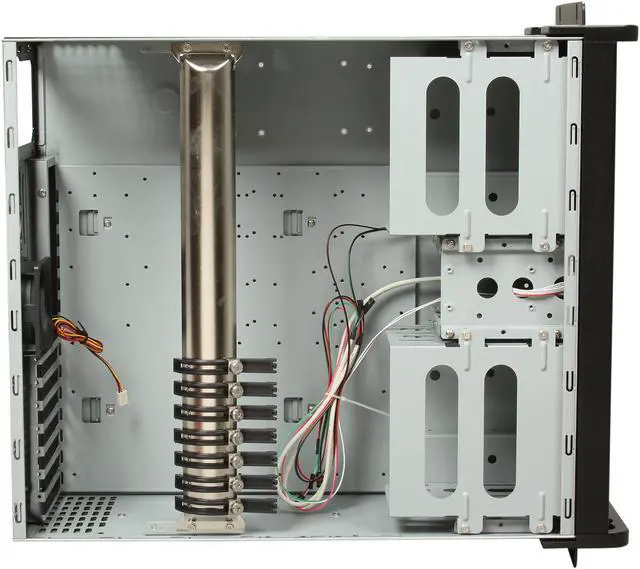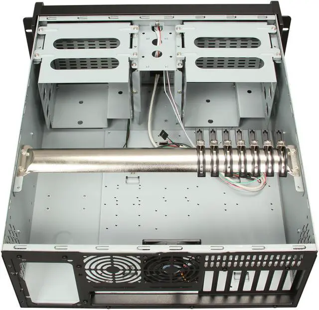 Pros: Nice size box, able to install 6 5.25″ removable HDD trays. Make for a nice rackmounted NAS box. Seems very well contrstructed working in this box was painless. After adding power supply and hard drives this thing is very heavy over 50 lbs. See other thoughts Cons: None really, if there is one the fans don’t have the monitor wire that I like so I can connect them to the motherboard and get data back. No big deal, if you need that then just by some and replace the ones that came with it. Overall Review: This box is hugh (hense 4U) it has an internal bar running from the left side of the case to the right side to give the case strength. You can take it out if you don’t need it, or it gets in your way (No issues for me). Also if you are going to rack mount this you may want to get yourself some rack rails, I can’t see mounting this thing just by the side rails on the case itself, although it seems strong enough where you could probably do that.
