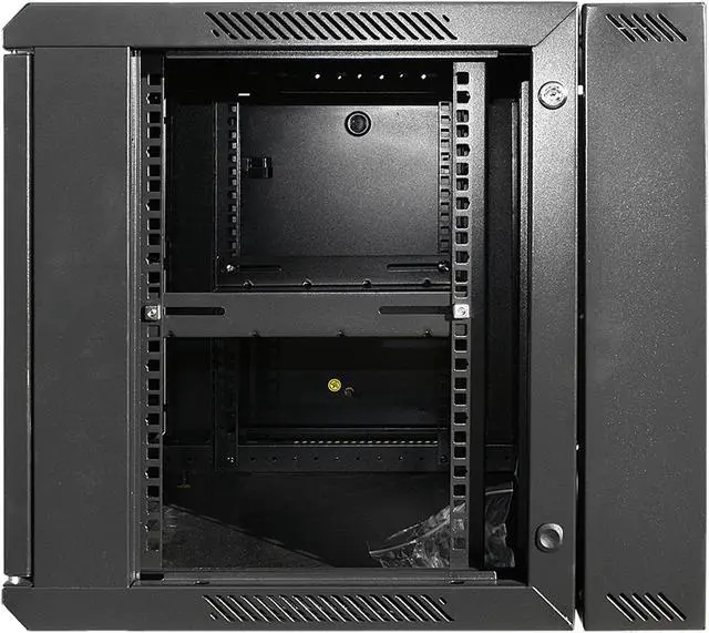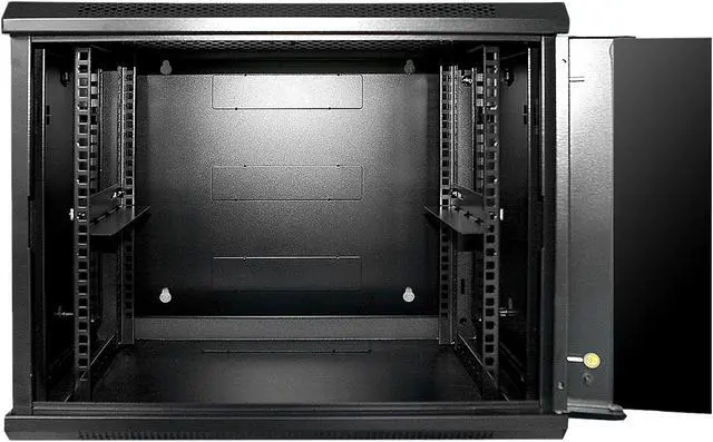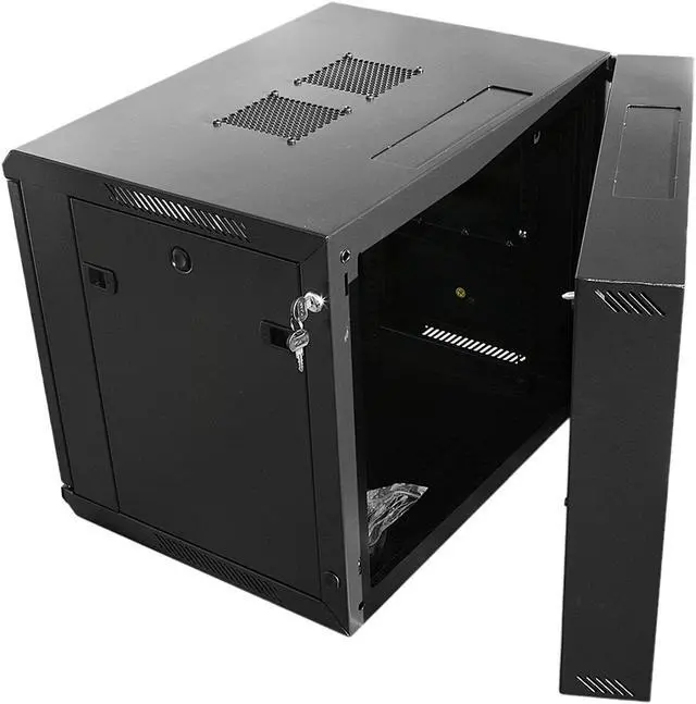 This cabinet is built tough and sturdy to support up to 130 lbs load. The side and front panel access make maintenance quick and easy, or you can swing the entire cabinet away from the wall for more maneuvering space. Secure locks also built in to prevent unauthorized access. Three ways, top, bottom, and rear cabling tunnels enable data and cable routing. The top vents, where you can mount two fans (not included), pair with ventilation holes on frames to enable efficient airflow. Heat-treated glass door provides extra strength and gives a sleek, elegant look.