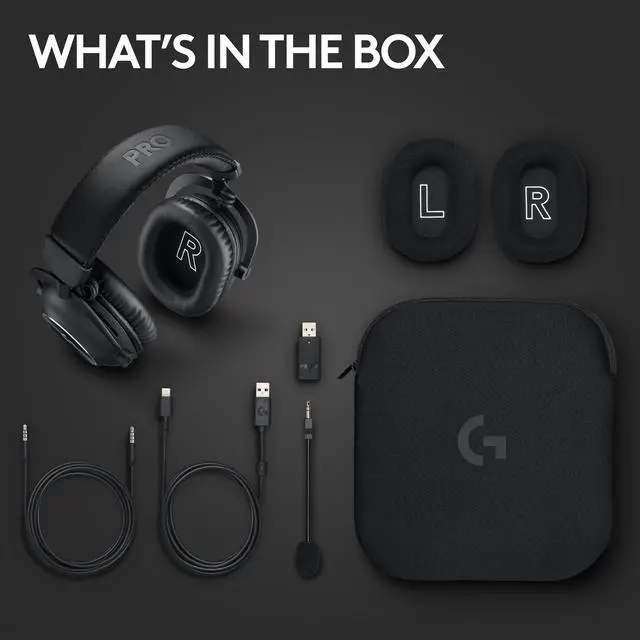 PRO X 2 Lightspeed gaming headsetMemory foam leatherette ear padsExtra memory foam cloth ear padsUSB-A LIGHTSPEED Wireless adapter with 3.5mm portDetachable mic with foam windscreenUSB-A to USB-C cable3.5mm cablesoft storage bagUser documentation |