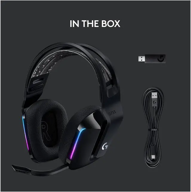 G733 LIGHTSPEED Wireless RGB Gaming HeadsetReversible soft headband (attached)Detachable microphoneLIGHTSPEED wireless receiver (USB-A)USB-C to USB-A charging cable |