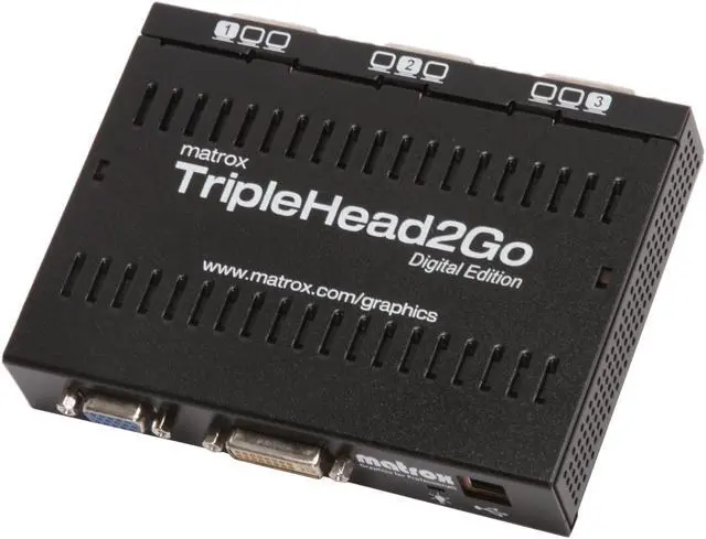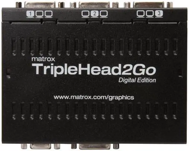 Lets you connect up to three monitors to the single Dual-link DVI or VGA video output of your systemCreates a stretched desktop with a maximum resolution of 5760×1080 (3x 1920×1080)1,2 across three displays or 3840×1200 (2x1920x1200) 2 across twoUses your system's existing GPU to deliver a solid platform for office ,3D design ,multimedia and digital signage applicationsWorks with LCDs ,CRTs and projectors3Open an application on each display or span one across multiple-screensExperience Surround Gaming by expanding supported 3D games across three monitors ,achieve a much wider in-game field of viewMatrox Bezel Management compensates for monitor bezel gaps to bring realism to gaming and digital signageQuick and easy to install ,there's no need to open the computer case or insert componentsSpans taskbar across monitors for easy access to all your open applicationsIncludes Matrox PowerDesk software to easily manage your desktop configurationExternal device that won't void your system warrantyExpand your desktop further by connecting a second TripleHead2Go to your graphics hardware to support up to six monitors at a time4PC and Mac compatible |