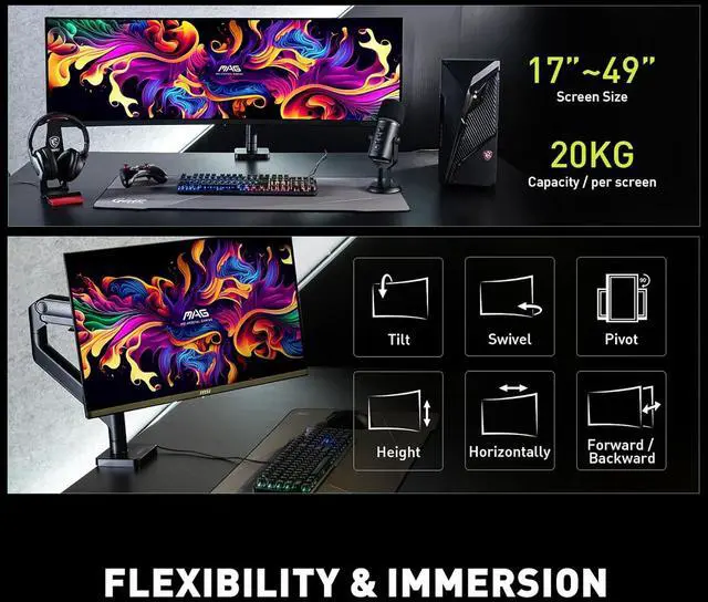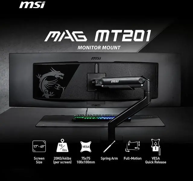 MSI MAG MT201 – Premium Heavy Duty Single Monitor Stand Arm, Supports 17-49″ Screens and 44 lbs, VESA Compatible, Adjustable Spring Assisted Mount,