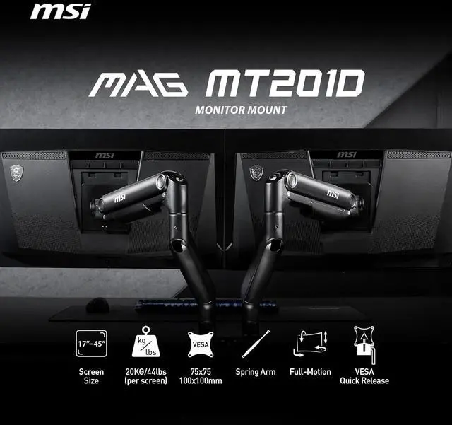 MSI MAG MT201D – Premium Heavy Duty Dual Monitor Stand Arms, 17-45″ Support, VESA Compatible, Adjustable Spring Assisted Mount, 44 lbs per Screen