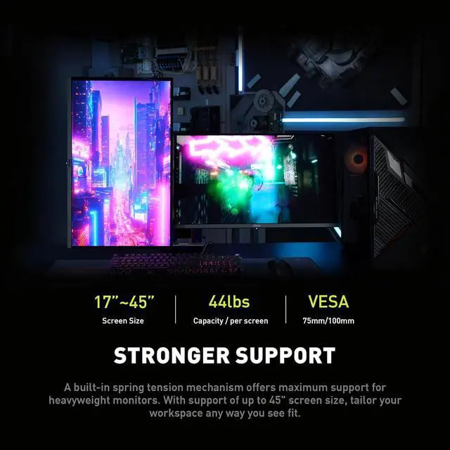 A built-in spring tension mechanism offers maximum support for heavyweight monitors. With support of up to 45″ screen size, tailor your workspace any way you see fit.