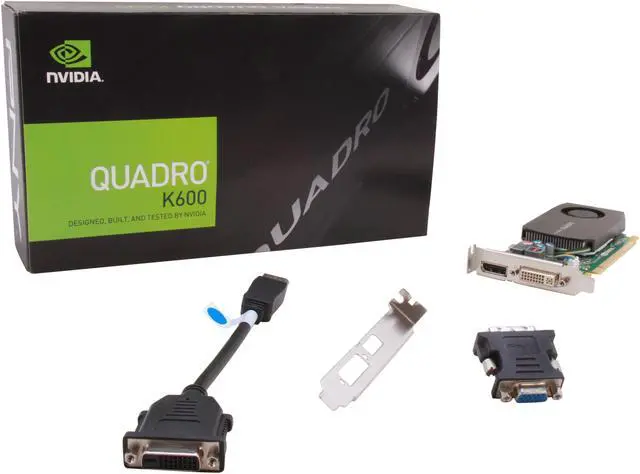 NVIDIA Quadro K600 professional graphics board with low profile bracketUnattached standard height bracketDisplayPort to DVI-D SL adapterDVI-I to VGA adapterDriver DVD for Windows 8 ,7 ,Vista ,and XP SP3 (32- and 64-bit)Printed QuickStart Guide |