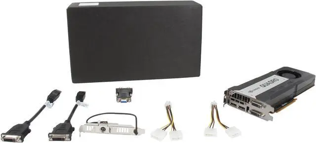 NVIDIA Quadro K6000 professional graphics board-Stereo connector bracket-Two DisplayPort to DVI-D SL adapters-DVI to VGA adapter-Two 6-pin auxiliary power cables-Software installation and documentation disc-Printed Quick Start guide |