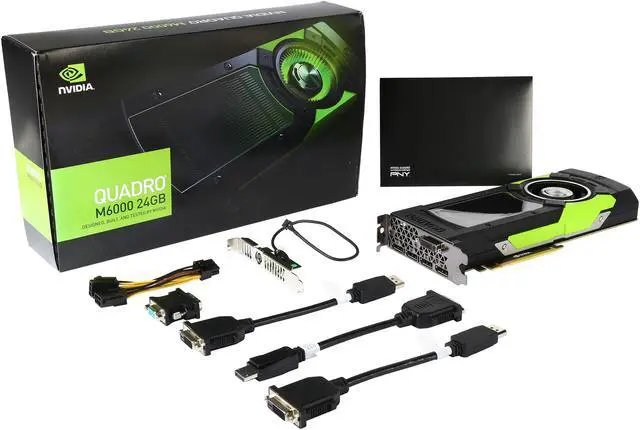 NVIDIA Quadro M6000 24GB professional graphics boardStereo connector bracketThree DisplayPort to DVI-D SL adaptersDVI-I to VGA adapter8-pin to dual 6-pin auxiliary power cableSoftware installation disc for Windows 8.1