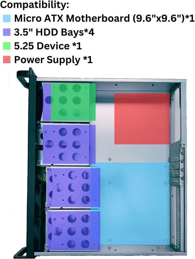 RACKOWL 2U Server Case/ Rackmount Server Chassis, 4x 3.5″/2.5″ HDD Bay, 1x 5.25″ Device, Micro-ATX Motherboard Support ; Fans: Rear 2x 80mm, Size: