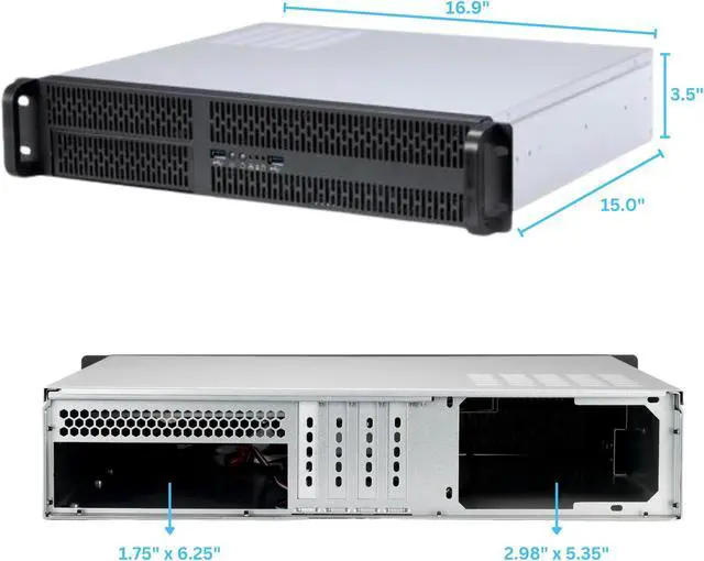 RACKOWL 2U Server Case/ Rackmount Server Chassis, 4x 3.5″/2.5″ HDD Bay, 1x 5.25″ Device, Micro-ATX Motherboard Support ; Fans: Rear 2x 80mm, Size: 16.9″x3.5″x15.0″