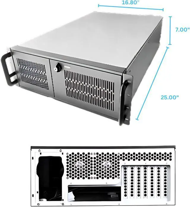 RACKOWL 4U Rackmount Server Case Chassis; 13*HDD Bays (10*3.5″ & 3*5.25″); E-ATX/CEB/EEB/ATX Mobo, Fan: Front 2*120mm, Mid 4*80mm, Rear 2*80mm, Front Panel Lock, Size:16.8*7.0*25.0″, RO-SC4U0650X001