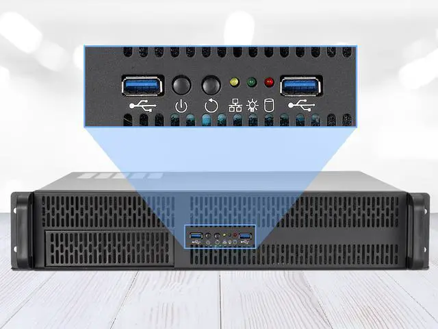 Server case features LED indicators for easy Power, LAN, and HDD status monitoring as well as (2) USB 3.0 ports.