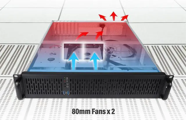 The server chassis comes equipped with (2) middle 80mm cooling fans pre-installed and has additional slots for (2) more 80mm fans for better heat management.