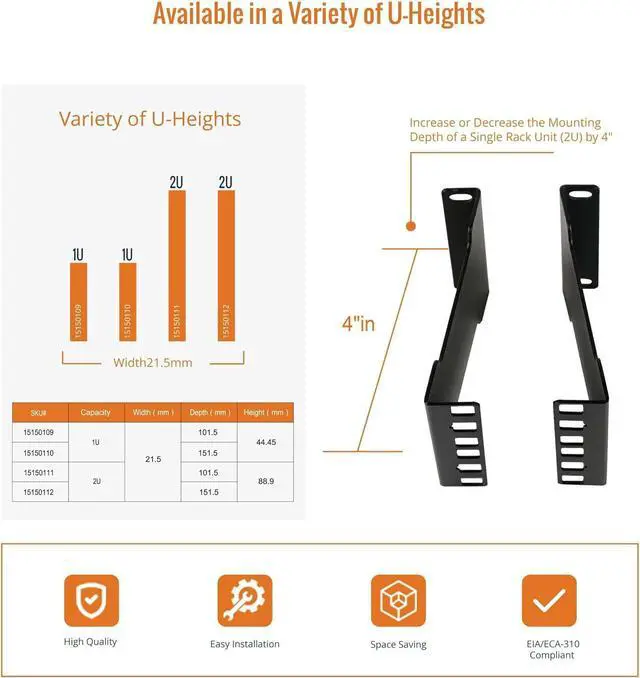 Server Rack Depth Extender – 2U – 4inch / 10 cm – TAA Compliant – Recessed Rack Adapter – Rack Mount Adapter Kit – Network Rack Extender