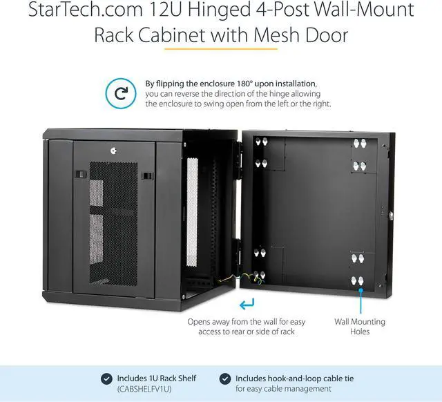Save space by wall-mounting your servers or networking equipmentHassle-free access with a hinged cabinetEasily install your equipment with adjustable mounting railsSecure your mission-critical equipment with a locked enclosureMaximize compatibility by switching the mounting rails between square cage nut holes or tapped 12-24 holes1U shelf and hook-and-loop cable tie included |