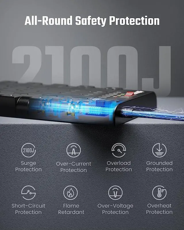 Higher rating = longer protection period. Every surge protector is rated for a certain number of J0ULES, and the higher the number of joules, the longer it lasts and the larger joules it protects against. 2100J is higher and more reliable than the competition to protect your TV or computer setup from voltage fluctuations, surges, and spikes.