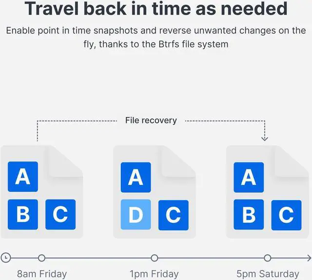 The advanced Btrfs file system helps safeguard data against corruption through file self-healing and allows for the reversal of unintentional or malicious changes through fast snapshot technology.