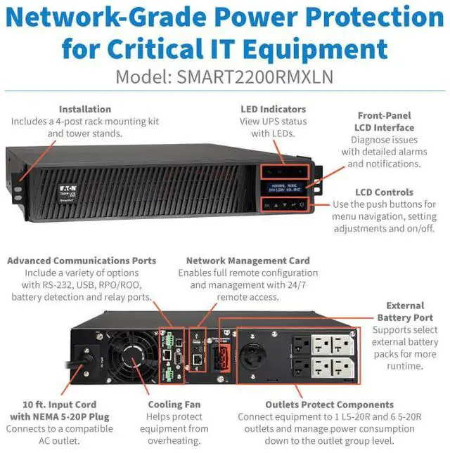 Tripp Lite series SmartPro 1950VA 1950W 120V Line-Interactive Sine Wave UPS – 7 Outlets, Extended Run, Network Card Included, LCD, USB, DB9, ENERGY STAR V2.0, 2U Rack/Tower (SMART2200RMXLN)