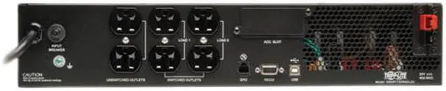 Tripp Lite SMART750RMXL2U line interactive 2U rack/tower UPS with 750VA ,.75kVA ,600W capacity and extended runtime optionsLine interactive UPS with Automatic Voltage Regulation (AVR) corrects brownouts and overvoltages from 83 to 147VNEMA 5-15P input plug ,6 NEMA 5-15R output receptacles ,Two independently switched output load banksMaintains uninterrupted operation of connected networking equipment during blackouts ,surges ,brownouts and overvoltagesHigh 95% efficiency rating in line-power mode offers reduced power consumption and BTU emisssionsInternal batteries offer 21 minutes at 50% load (300W) and 8.5 minutes at 100% load (600W)External battery configurations require the use of Tripp Lite's External Battery Configuration Software (see manual)Hot-swappable ,user-replaceable internal batteries and external battery packs can be replaced with no disruption to connected equipmentFront panel LCD monitoring screen with MODE and ENTER buttons reports operating mode with 5-bar battery charge graphic ,plus 7 selectable screens of detailed UPS and site power informationLCD interface also supports a number of advanced user setup and operating preferencesBuilt-in USB ,RS-232 and optional SNMPWEBCARD accessory monitoring optionsHID-compliant USB interface enables integration with built-in power management and auto shutdown features of Windows and Mac OS XIncluded PowerAlert UPS monitoring software ,Built-in Emergency Power Off (EPO) interface with cable3-year warranty with registration |
